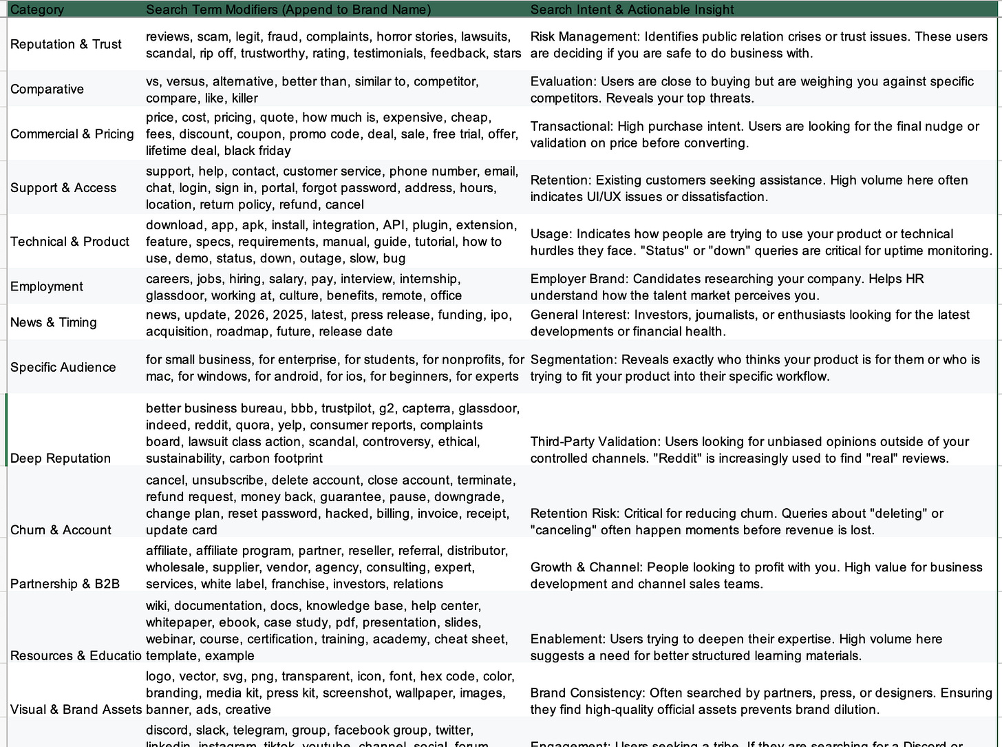 Brand keyword worksheetEli SchwartzOct 12, 0002∙ PaidShareUse these keyword modifiers to ensure you are visible for as many brand terms as possible. You can and SHOULD track these manually or use any commercial rank-tracking tool.Continue reading this post for free, courtesy of Eli Schwartz.Claim my free postOr purchase a paid subscription.Next