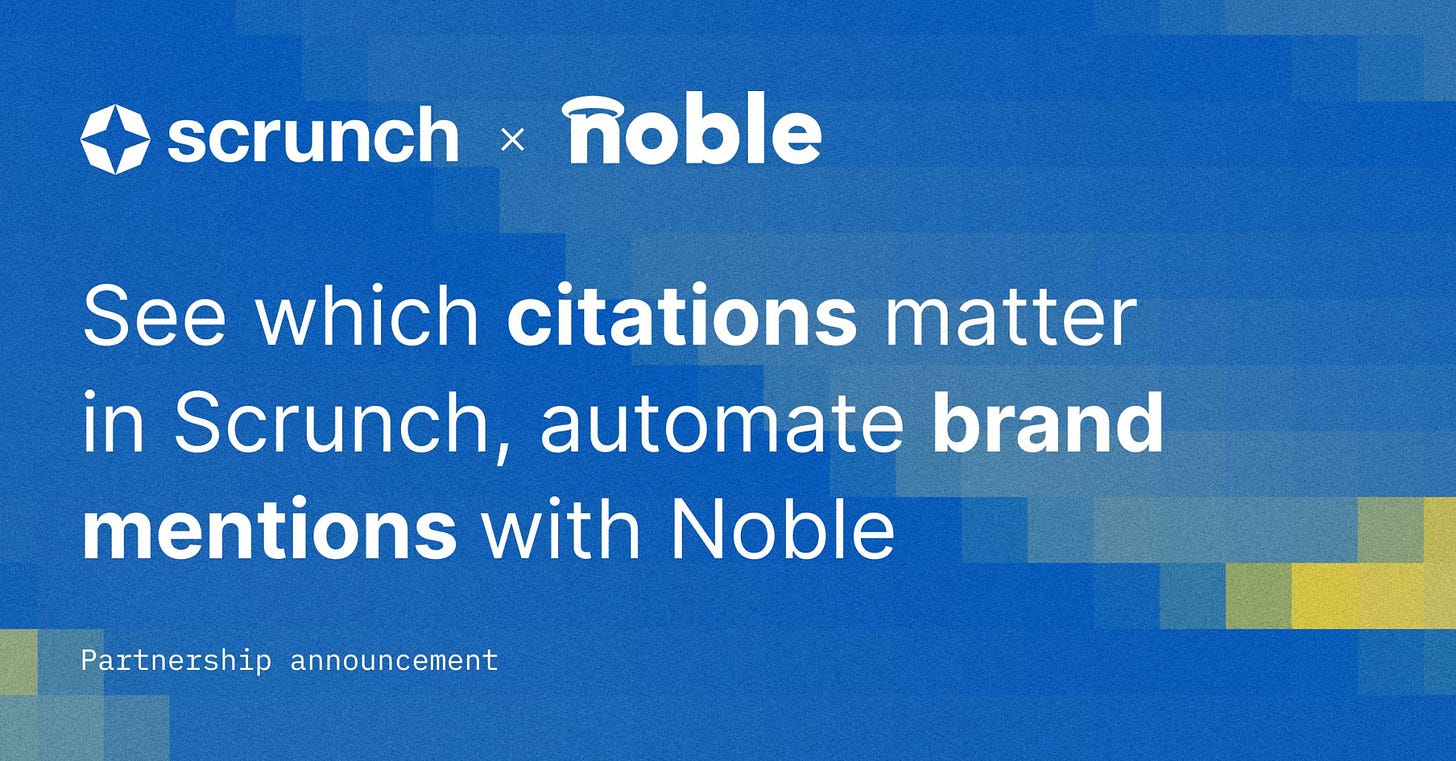 Citations drive AI answers. If you’re not mentioned in the right cited sources, you’re not showing up in AI search. Scrunch and Noble are partnering to help you do something about it. Scrunch shows you which citation sources actually matter for the prompts you care about, breaking down citation share by owner, influence score, and whether you (or a competitor) are mentioned. Noble automates the citation placement process—handling outreach, negotiations, drafting, payments, and reporting. Get full visibility into citations that will move the needle for your brand and scale mentions minus the manual outreach.