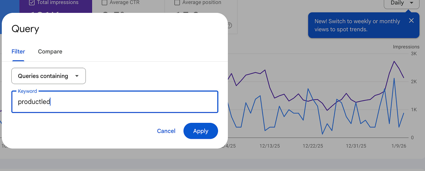This step captures all branded queries that land on random pages across your site rather than your homepage. Maybe you have a blog post from three years ago that mentions your brand name and a product category, and now it’s the top result for that combination. But the blog post doesn’t actually help someone who wants to buy that product. Or maybe you have a support article ranking for a branded product query, when you should really have a proper product page for that term.