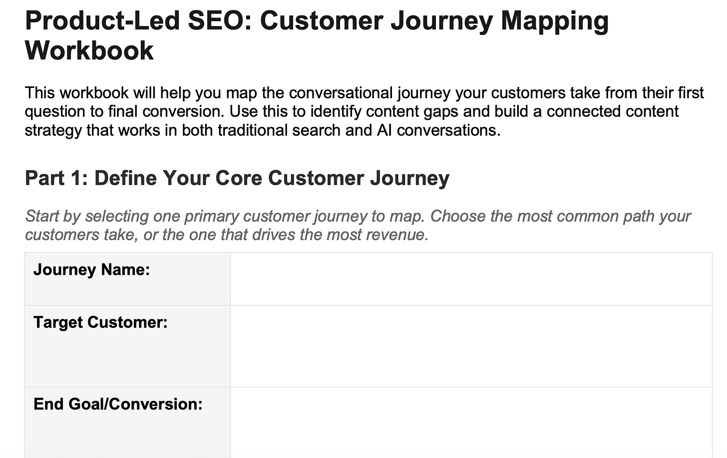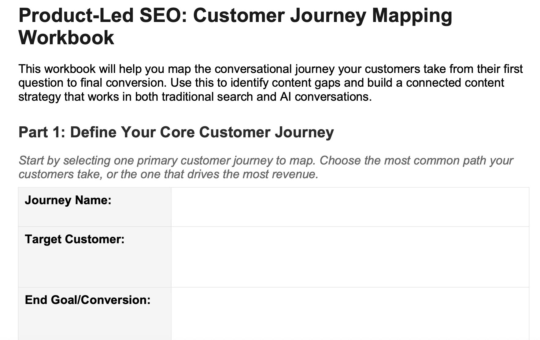 This workbook will help you map your customers' conversational journey from their first question to final conversion. Use this to identify content gaps and build a connected content strategy that works in both traditional search and AI conversations.