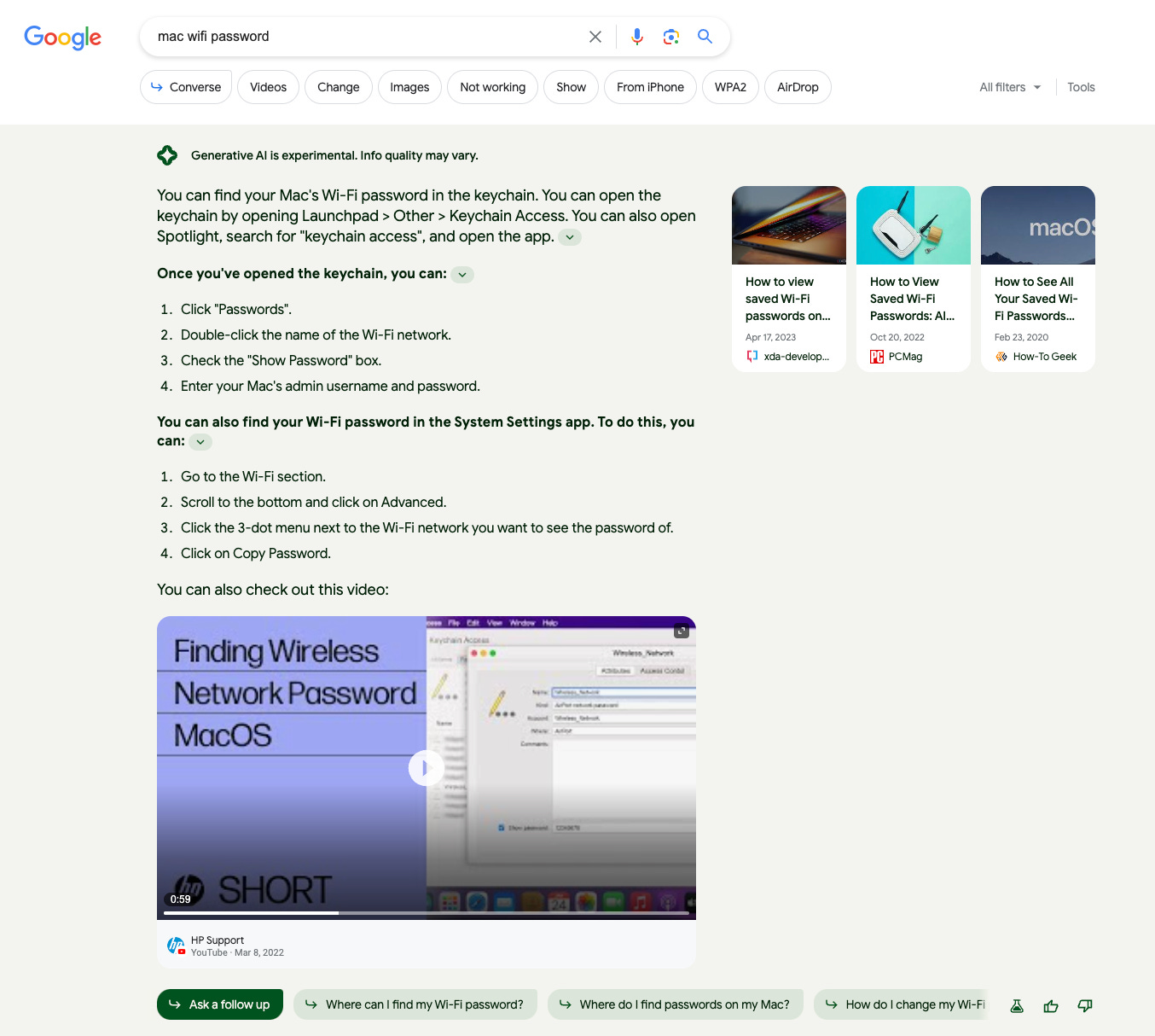 In addition to including links within the content, Google also includes more rich media. Note the video below that can be played right in the result. Funny enough, it is a bit of a mismatch because the query is about a Mac because the video comes from HP. 🤷♂️