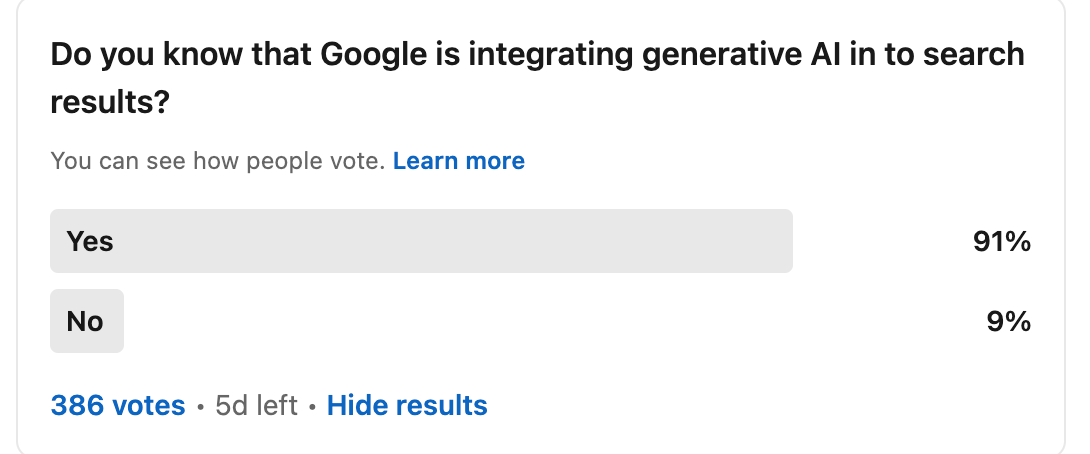 Most people in the world are unaware of the hurricane that Google is about to unleash on search. I was even completely surprised when I met with SEO teams with no idea what SGE was. I wrongly assumed that everyone who derived their income from SEO made it a priority to be aware of everything happening in search, especially big things. To put data behind this, I posted a poll on Linkedin to an audience I believe is mostly tech industry people, and 9% of respondents were unaware of SGE.