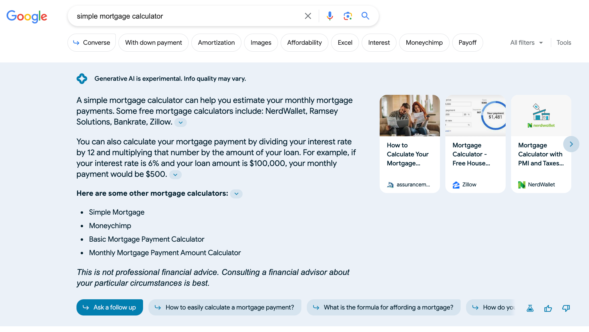 Interestingly, mortgages are an area where SGE seems to be a moving target. At launch, the query “mortgage rates” generated a very updated content response referencing the previous day’s rates. At present, there is no SGE response at all. Google is incorporating all feedback on SGE; what you see today can always change.