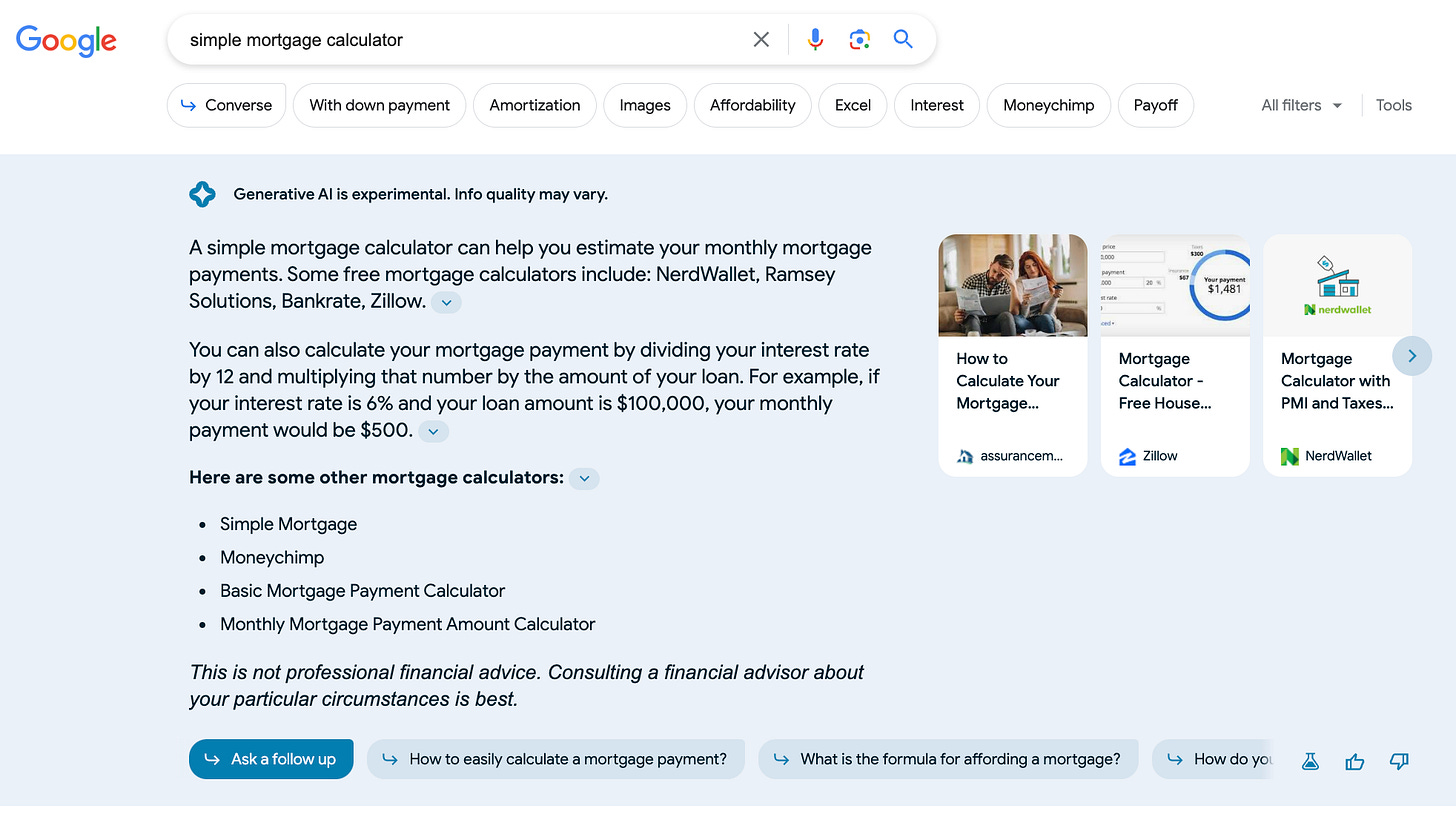 Look at the result below as an example of a constantly shifting landscape when SGE results show up (in support of my earlier traffic prediction). The obvious result should be an actual calculator, and Google does have one, but the SGE result is a content response.