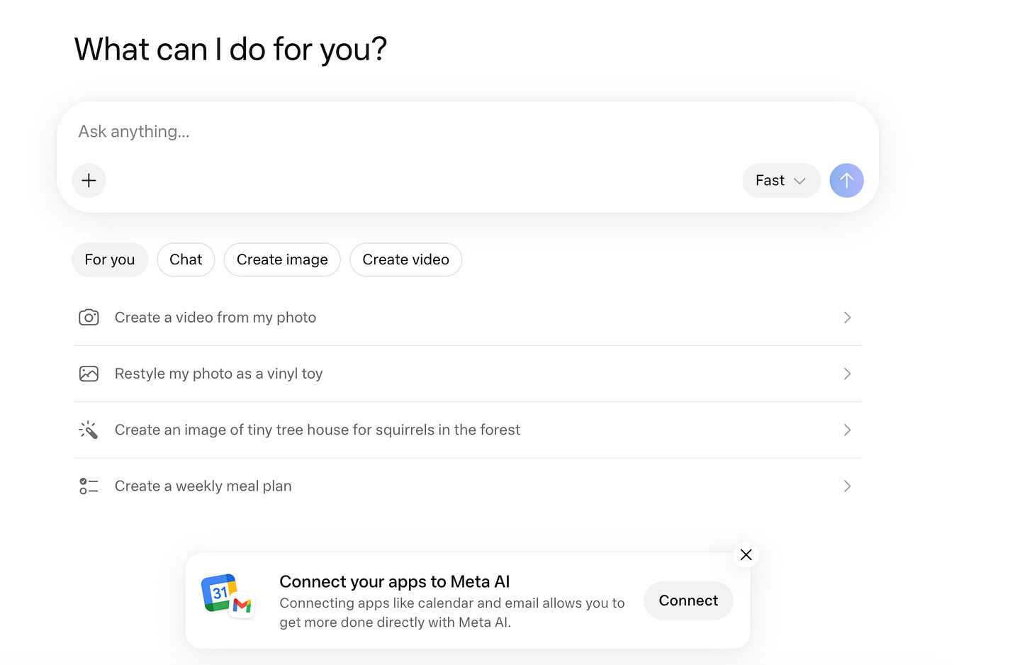 Meta even has an LLM landing page, which functions like any LLM, with image generation, chat responses, and the ability to connect to Google data.