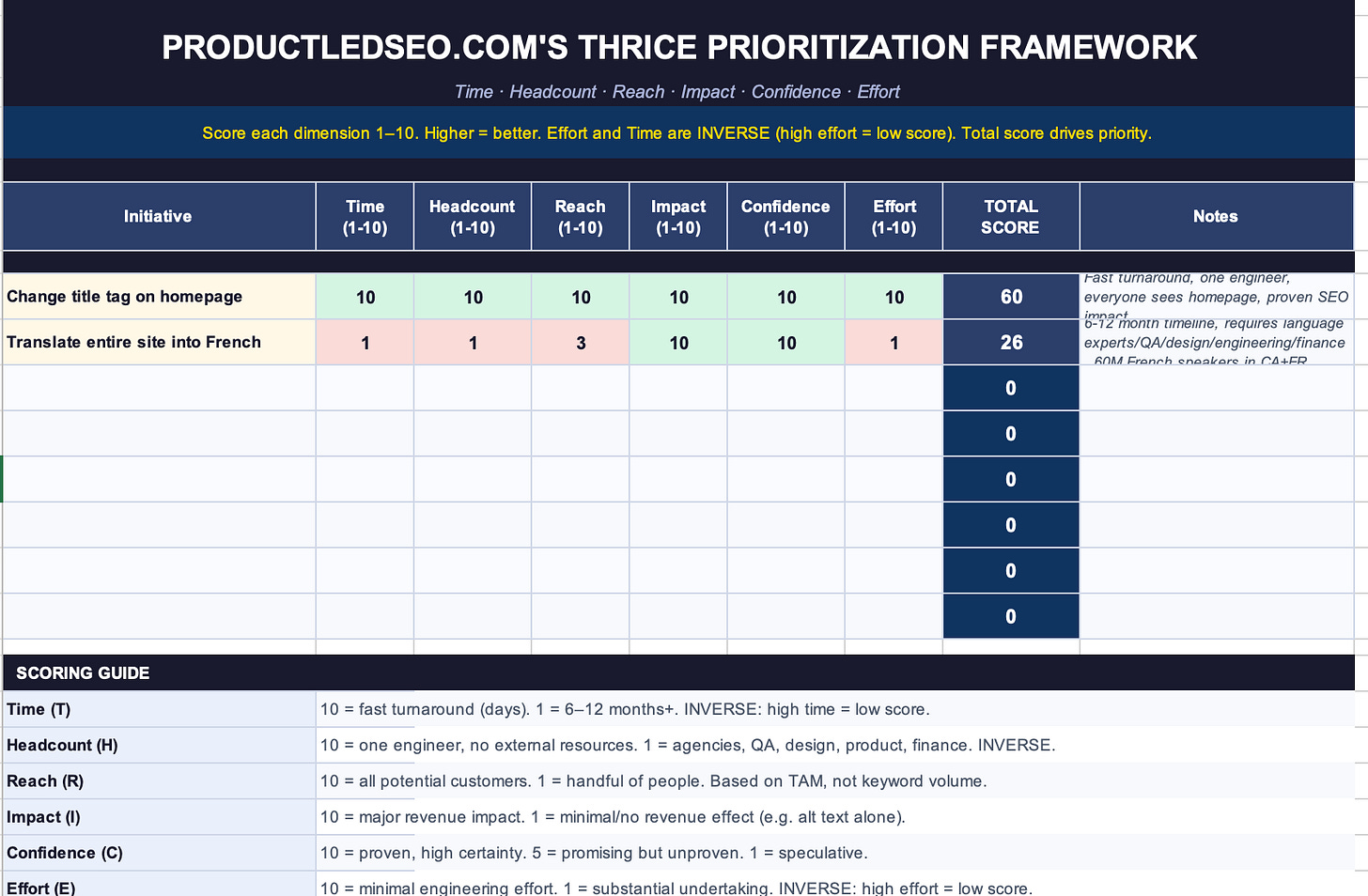 The framework extends to SEO tests, acquisition ideas, and agency selection. Most SEO teams will read this and think they already prioritize well. They don’t. They prioritize loudly, where everything is mission-critical, and then nothing gets done. THRICE forces the argument into numbers before it becomes a meeting.