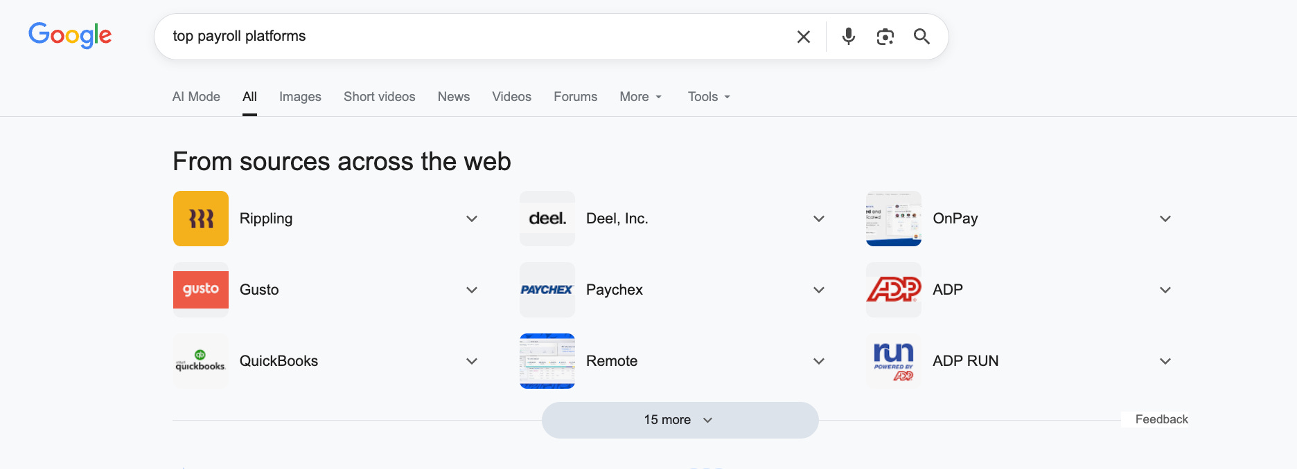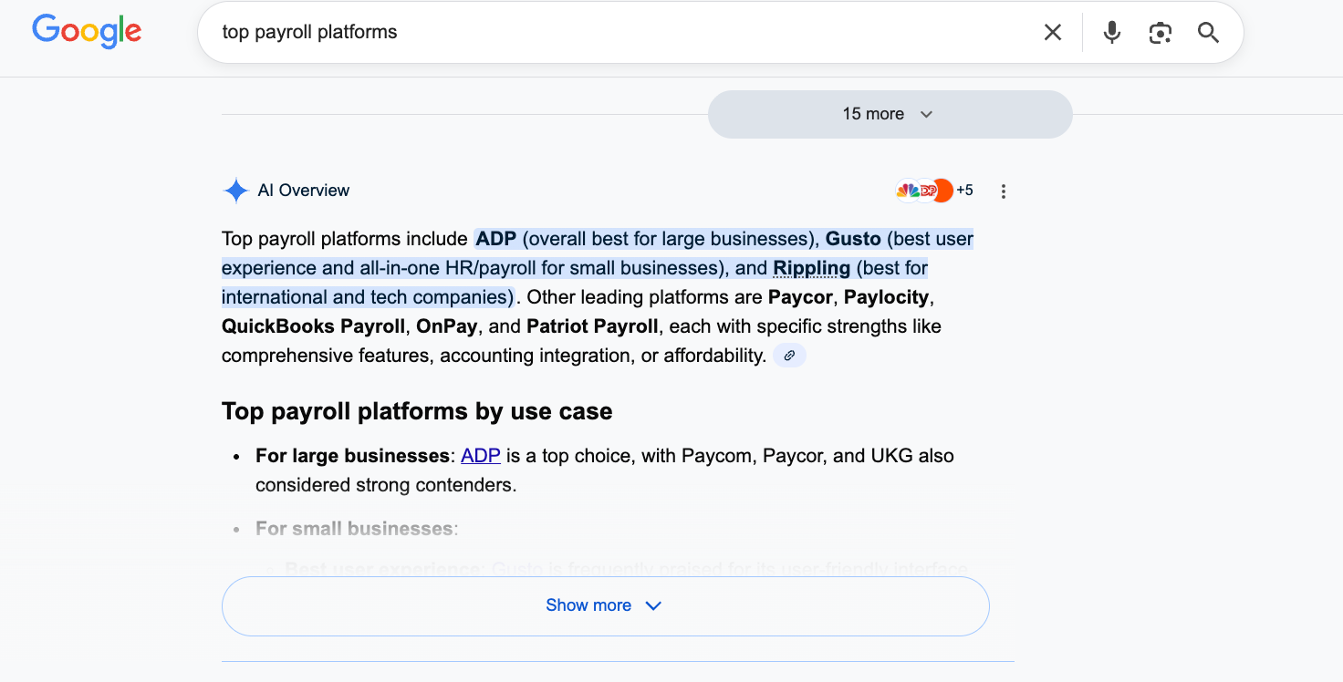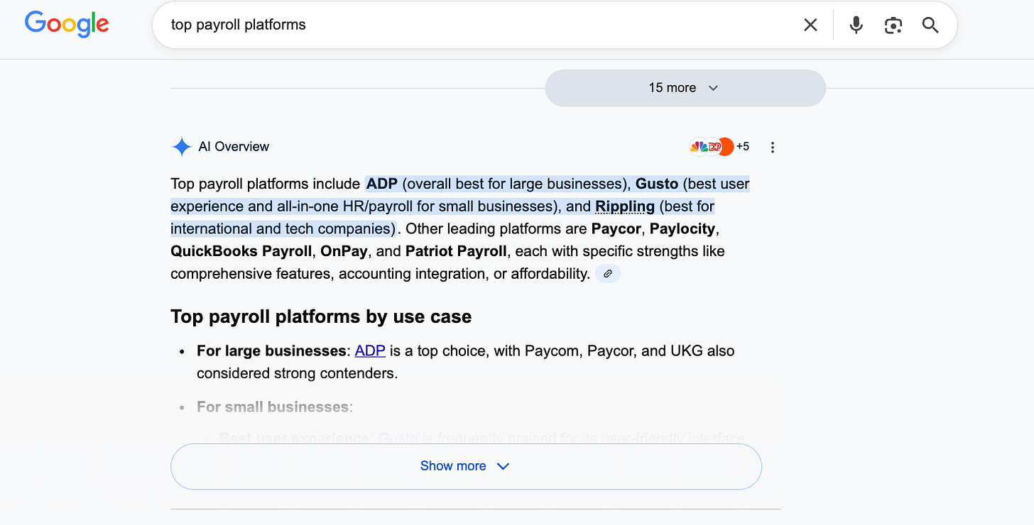 It’s not just ChatGPT that is making this end-user leap; Google has been trending in the same direction of providing solutions rather than links with featured snippets and knowledge panels. See the original results for “top payroll platforms” before the AI Overview.