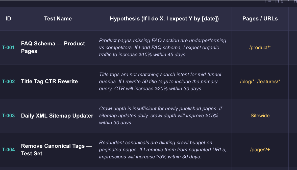 Writing a hypothesis is quick and delivers outsized value because it builds a knowledge repository. This compounding is where you get the real value because every confirmed hypothesis teaches you something about how your site, in your specific category, with your distinct competitive set, behaves in search. That knowledge doesn’t come from a blog post or a conference talk.