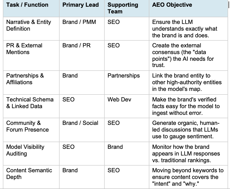 Don’t let the brand team shirk this responsibility. As long as AEO is a line item on the SEO P&L, the brand team will treat it as “tech stuff” and ignore it.