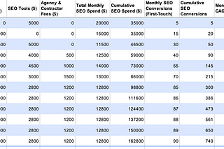 When calculating CAC for an SEO effort, add all direct costs, then divide them by conversions to arrive at CAC.
